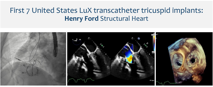 Dee Dee Wang教授隨后分享了Henry Ford Hospital前7例LuX-Valve Plus的植入經驗,并提示術中確定瓣葉夾持鍵的位置處于三尖瓣瓣環下方(右心室側),以及室間隔固定片與室間隔的相對位置關系是最關鍵的兩個步驟。通過經胃底短軸切面,配合右室流入/流出道切面的X-plane就能較容易地獲取相關影像。由于LuX-Valve Plus對超聲影像的要求較低,手術過程簡單易操作。