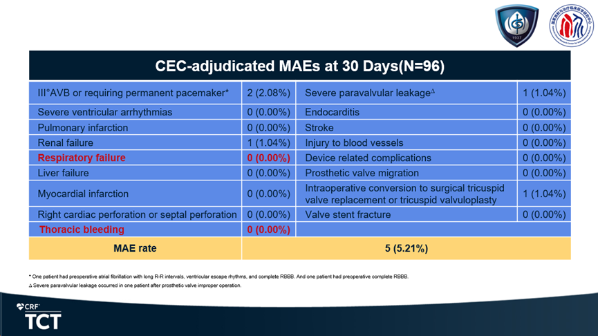 心肌梗死、卒中、使用ECMO或IABP、急性肝功能衰竭、長期機械通氣(>72小時)、需要外科干預的心血管損傷(心臟穿孔、血管損傷)、危及生命的大出血事件發(fā)生率均為0全因死亡率僅為1.08%(與器械無關(guān)) 急性腎臟衰竭、重度瓣周漏和中轉(zhuǎn)外科三尖瓣置換或成形術(shù)發(fā)生率均僅為1.08%新發(fā)Ⅲ度房室傳導阻滯需植入永久心臟起搏器發(fā)生率僅為2.16%