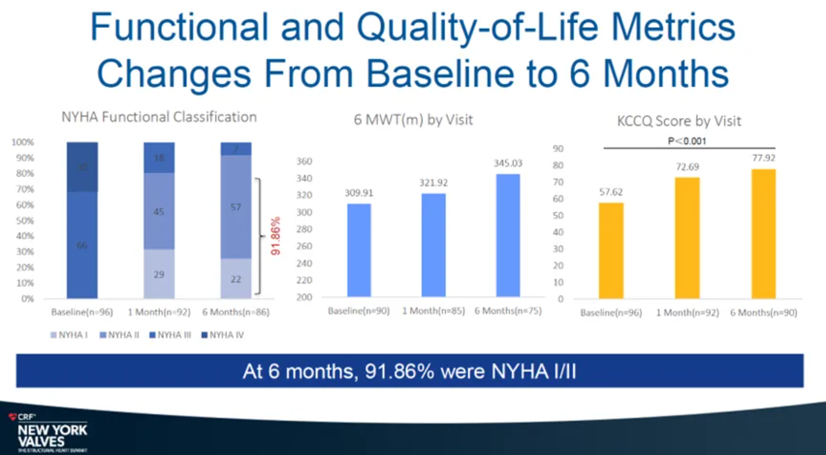 有效性結果顯示,患者的反流等級、心功能等級,以及生活質量顯著改善。100%的患者在30天顯示無中度及以上反流,97.62%的患者在6個月期時顯示無中度及以上反流。同時,根據超聲數據顯示,患者右心系統重構也獲得受益。